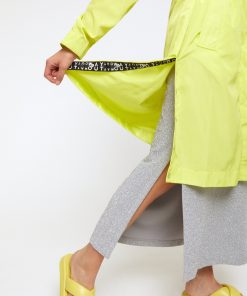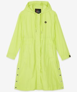 Midi trench coat with hood with drawstring and slits and buttons at the bottom.