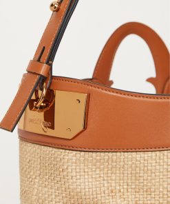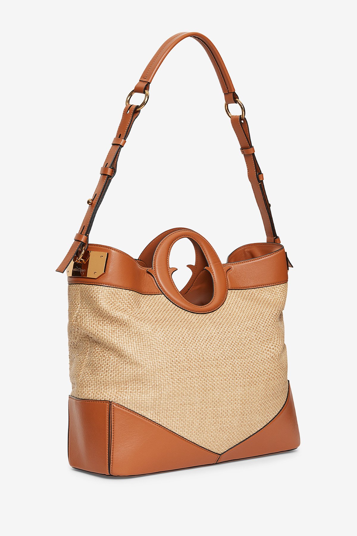 Straw bag with leather details, large tote style with leather logo handle and adjustable shoulder strap. Interior with two storage pockets, central zipped compartment and zipped side pocket. Gold finish. Dimensions: 38×35.5×14 Shoulder strap length: 30 cm